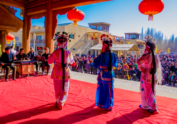 中午1時30分,月牙泉小鎮(zhèn)人山人海,萬人空巷。秦腔折子戲、敦煌曲子戲等多種劇目在景區(qū)戲樓處輪番上演,現(xiàn)場異彩紛呈,戲曲表演者以優(yōu)美的唱腔、獨特的韻白、別致的風姿得到萬名戲迷的陣陣掌聲和喝彩聲。